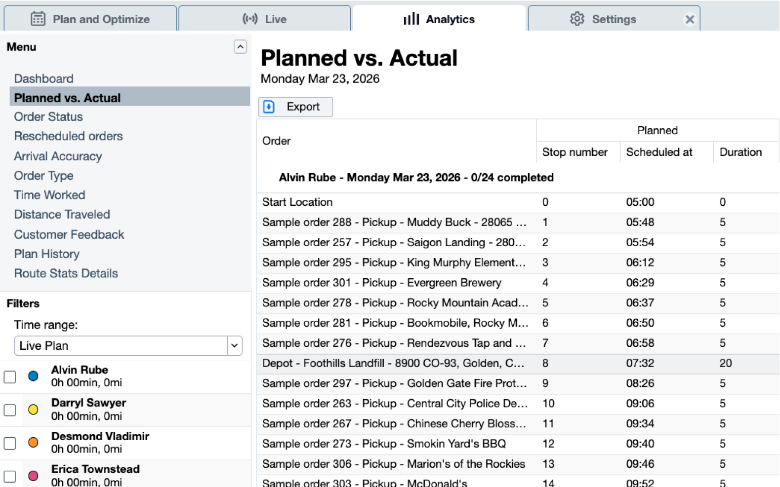Al generar las rutas, los vehículos se dirigirán al depósito más cercano o eficiente para cargar o descargar. Podrás ver las paradas en depósitos en la cuadrícula de órdenes, la línea de tiempo, la pantalla en vivo y en los análisis.
