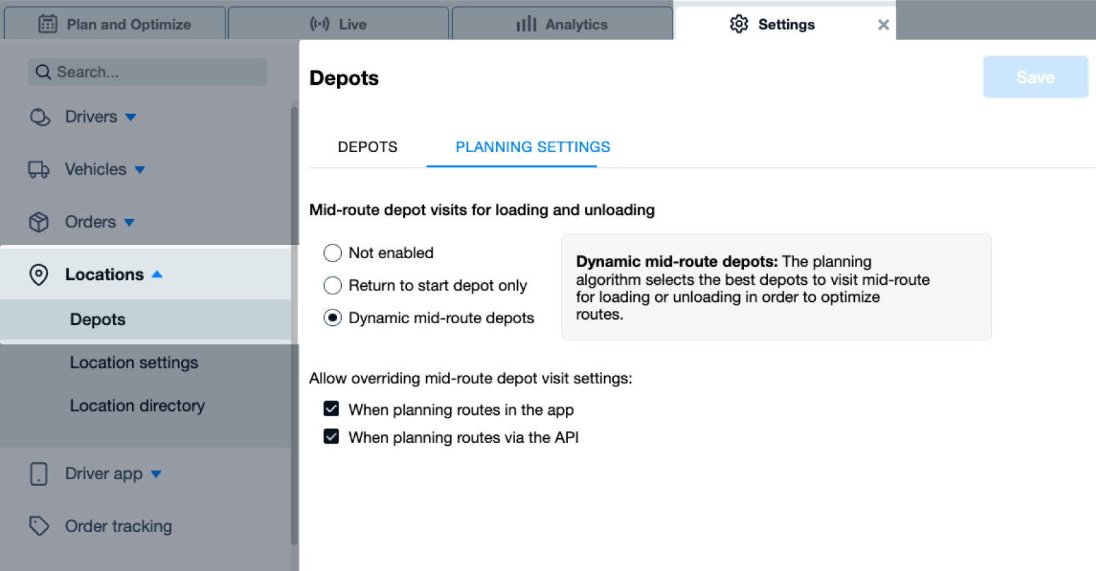 También puedes definir si estas opciones pueden ser modificadas por los despachadores en la configuración de planificación dentro de la aplicación o el API (si está habilitado). Si se permite la anulación, los despachadores verán la opción “Anular configuración por depósito” en su ventana de planificación.